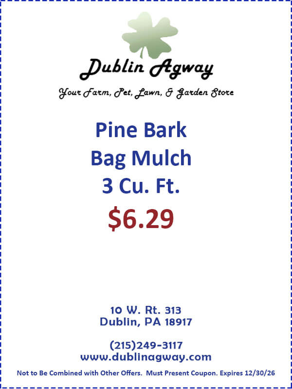 dublinagway.com 10 W Rt. 313 Dublin, PA 18917 (215)249-3117 Dublin Agway For all your farm, pet, lawn, and gardening supplies, come to Dublin Agway Dublin Agway – Blue Seal High Performance Dog Food $5.00 off Agw-1-25-5B Take $5.00 off a 40lb Bag of Blue Seal Native High Performance Dog Food. Not to be combined with other offers. Must present coupon at time of purchase. More Less Expires on: 12/31/2026 Click To Print Agway – Pine Bark Mulch $6.29 Agw-1-26-629 Pine Bark Mulch - 3 cubic feet only $6.29 Not valid with other offers. Must present coupon at time of purchase. More Less Expires on: 12/31/2026 Click To Print