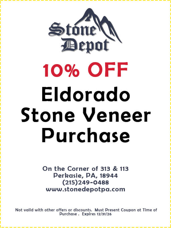 Take 10% off any Eldorado Stone Veneer Purchase.  Must present coupon at time of purchase.  Prior sales excluded. Not to be combined with other offers.