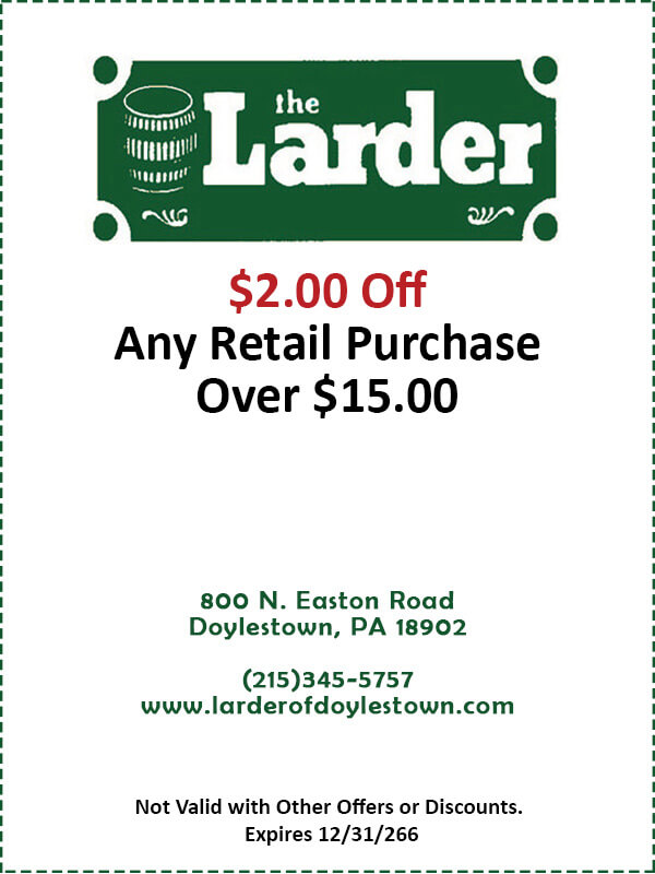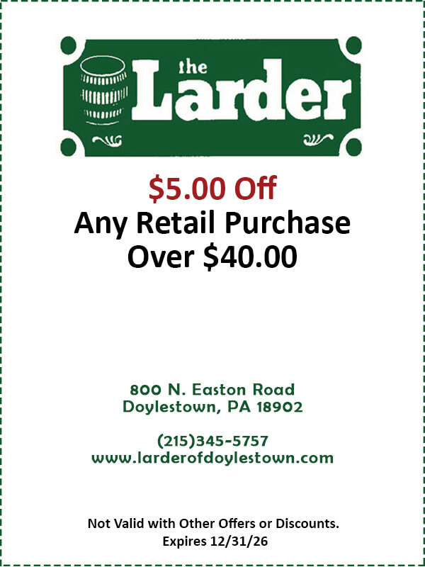 Cross Keys Plaza800 N. Easton RoadDoylestown, PA 18902 larderofdoylestown.com (215)345-5757 The Larder Dried Fruits Nuts Candies Natural Foods Coffee & Tea Pastas The Larder $1.00 off $10.00 $1.00 off Lard1-26-110 Take $1.00 off retail purchase of $10.00 or more. Not to be combined with other offers. Must present coupon at time of purchase. More Less Expires on: 12/31/2026 Click To Print The Larder $2.00 off $15.00 $2.00 off Lard1-26-215 Take $2.00 off any retail purchase of $15.00 or more. Not to be combined with other offers. Must present coupon at time of purchase. More Less Expires on: 12/31/2026 Click To Print The Larder $5.00 off $40.00 $5.00 off Lard1-26-540 Take $5.00 off any retail purchase of $40.00 or more. Not to be combined with other offers. Must present coupon at time of purchase. More Less Expires on: 12/31/2026 Click To Print The Larder Custom Gift Basket 10% off Lard1-26-10Gift 10% off all Custom Made Baskets. Not to be combined with other offers. Must present coupon at time of purchase. More Less Expires on: 12/31/2026 Click To Print